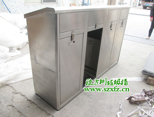 深圳師范學(xué)院附屬中學(xué)款式的C170五分類環(huán)保回收箱規(guī)格為:1600*400*860mm.外表是一款全新不銹鋼材質(zhì)打造而成.不銹鋼垃圾桶頂部有五個垃圾投放組合,圓形垃圾投口分別左,右,中間,還有兩個半圓在中間部位。不銹鋼垃圾桶正面開有五個門,每一個門前都有一個小鑰匙配套開門。正面中間橫幅有LOGO的標(biāo)準(zhǔn),還有深圳大學(xué)師范學(xué)院附屬中學(xué)字樣及英文拼音字母組合而成。不銹鋼垃圾桶五個取放垃圾內(nèi)膽正門,絲印有五個垃圾投放標(biāo)志。從左到右依次回收塑料罐,金屬罐,利樂包,紙張,有害垃圾及標(biāo)志。不銹鋼垃圾桶外觀為方形,具有獨特的堅固耐用,不易破損;耐火安全,抗高低溫等優(yōu)勢。適合各大院校,高檔場所使用。