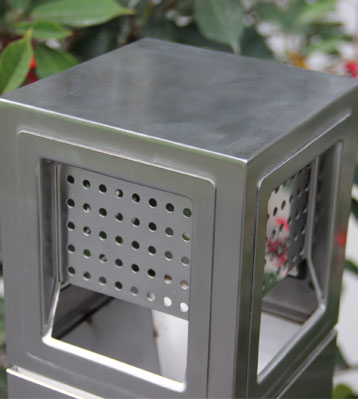 不銹鋼歐式煙灰柱方形設計,大投口加面板鉚釘,面板有孔位便于未燃燒盡煙的空氣流通,預留小的煙蒂投口確保精準投放。